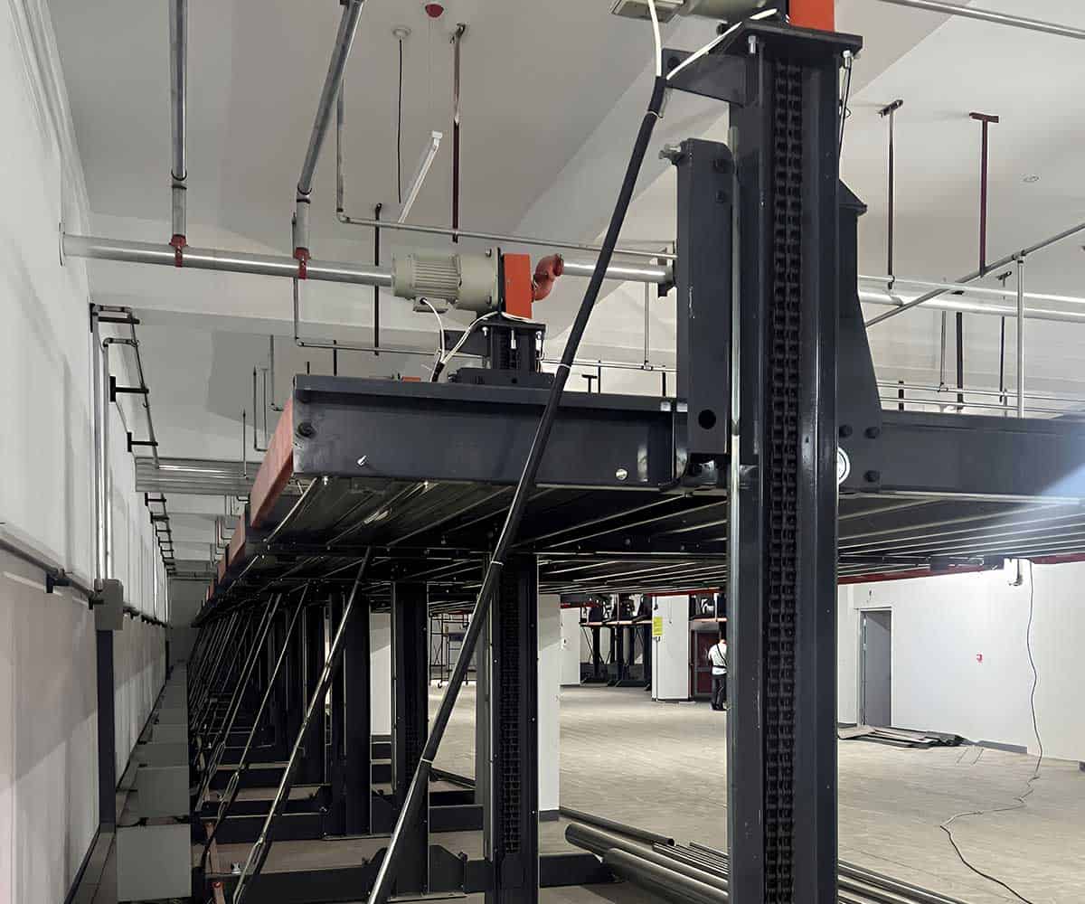负一正三地坑四层升降横移停车顶层及底层车位只做升降运动,设备出入层车位只做横移运动,设备中间层做升降及横移运动。设备造价低、维保费用低;运行平稳,噪音低,存取车方便;人车误入报警、限位保护、松绳保护、防坠落保护、车辆超长报警、延时保护、过(欠)压保护过流、断电自锁、紧急停车等全方位安全防护;设备占地面积小空间利用率高